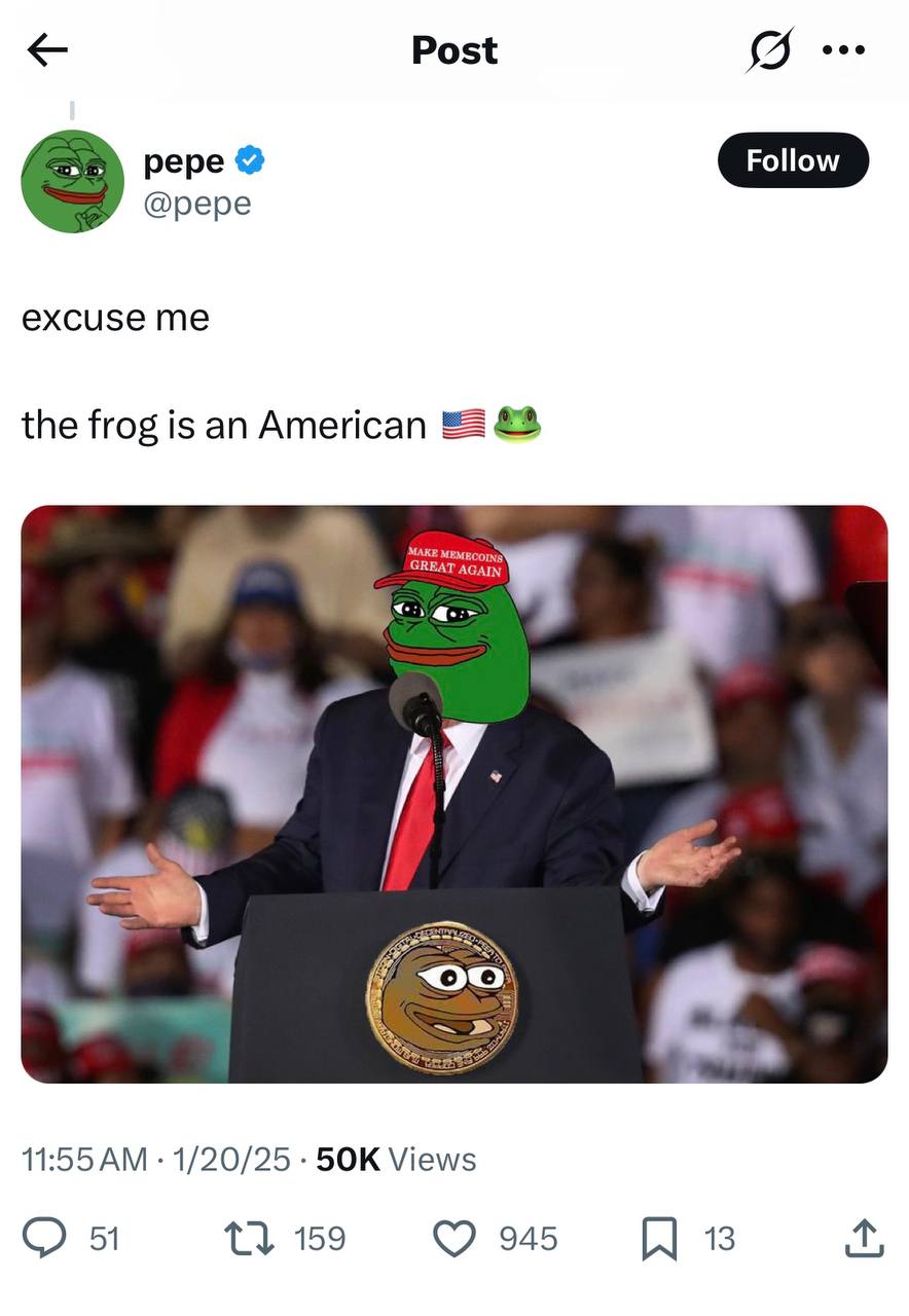 Mysteriously launched from the same deployer as Pepe. It’s like Pepe but even more American.